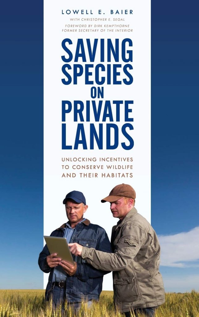 Saving Species on Private Lands: Unlocking Incentives to Conserve Wildlife and Their Habitats. Lowell E. Baier with Christopher E. Segal. 2020. Rowman & Littlefield. Paperbound, 6 by 9 inches (15×23 cm), 341 pages; with list of illustrations, guide to acronyms and terms, foreword (Dirk Kempethorne), introduction and chapter summaries, appendices, acknowledgements, bibliography and index. ISBN 978-1-5381-3938-7. US$28 (with promo code RLFANDF30) from rowman.com.