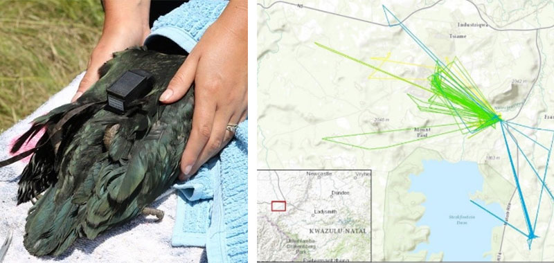 Right: Initial tracking data captured from a juvenile Southern Bald Ibis chick tagged in January 2014 (BirdLife SA)