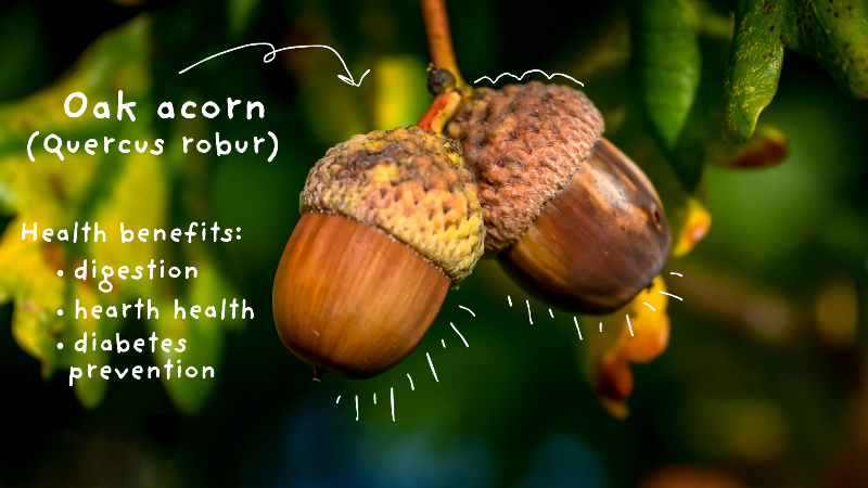 The common oak acorn (Quercus robur) is a great source of protein and can even be ground up and used as a flour substitute. White oak acorns have the least tannins and are less bitter, and thankfully for us, all species of acorns are edible. The best season to be on the lookout for acorns is autumn—September through October—so you might have to battle a few squirrels on the way to secure a good harvest of this iconic tree nut!